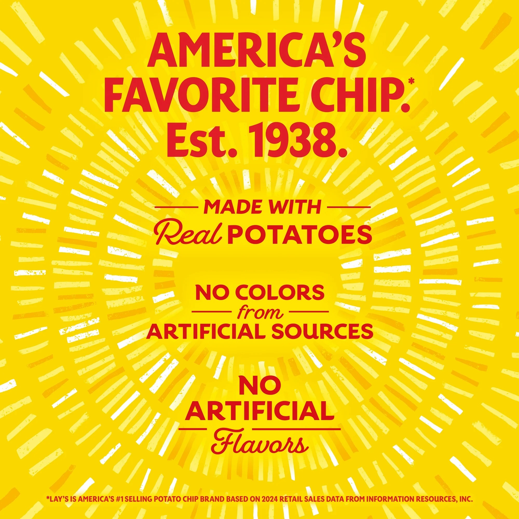 Aardappelen, plantaardige olie (canola, maïs, soja en/of zonnebloemolie), suiker, en minder dan 2% van de volgende ingrediënten: zout, dextrose, torula-gist, ui-poeder, tomatenpoeder, maïsmaltodextrine, specerijen, bruine suiker, fructose, melasse, gist-extract, natuurlijke aroma’s, honing, paprika-extract (kleur), knoflookpoeder, citroenzuur, vruchtensap (kleur).